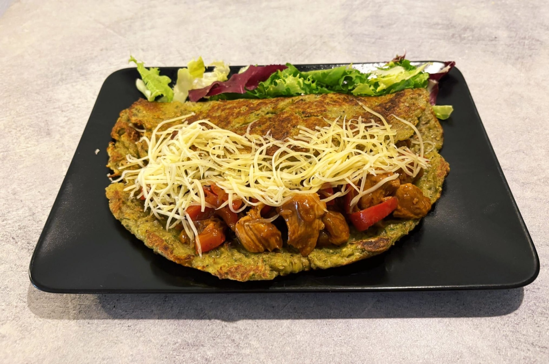 chilli omáčka,vepřové+kuřecí maso,česnek,cibule, paprika, sýr eidam,salátek