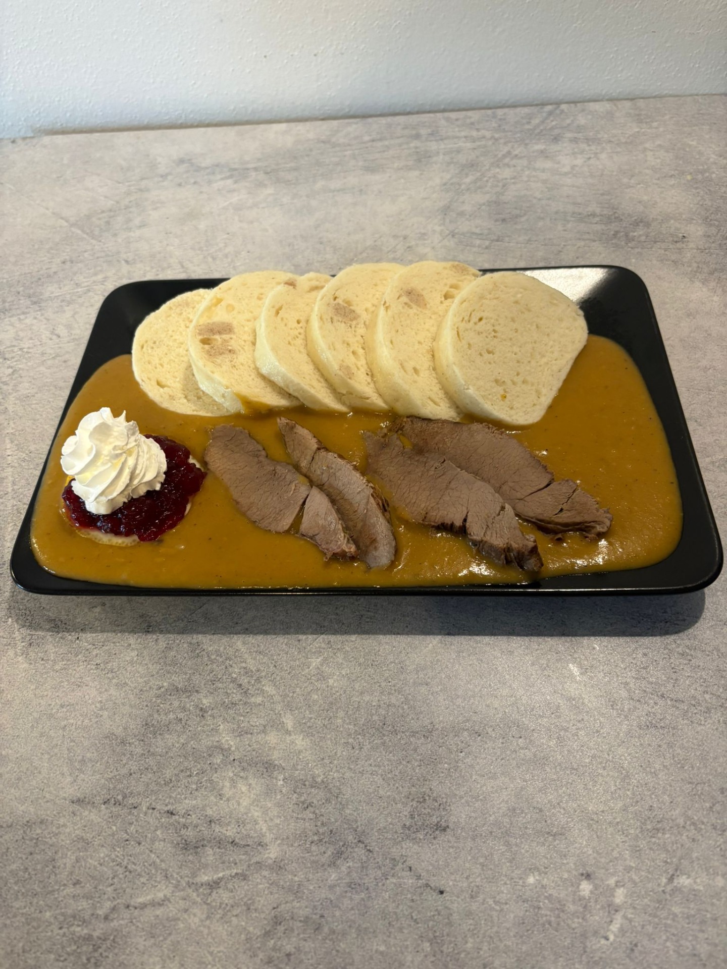 Kančí kýta na smetaně,houskové knedlíky (1,3,7) 265kč